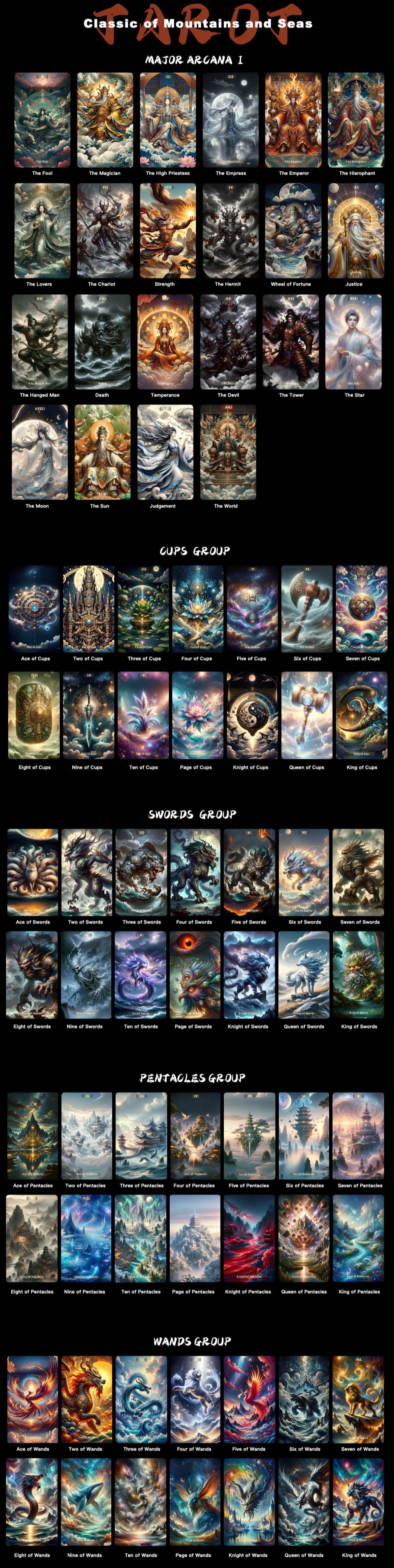 The Classic of Mountains and Seas Tarot deck will include all 22 Major Arcana and 56 Minor Arcana cards. The 22 cards of the Major Arcana depict Eastern deities, each with a story passed down through generations. Surprisingly, we have discovered many similarities between these stories and the allegories hinted at in the tarot cards.
