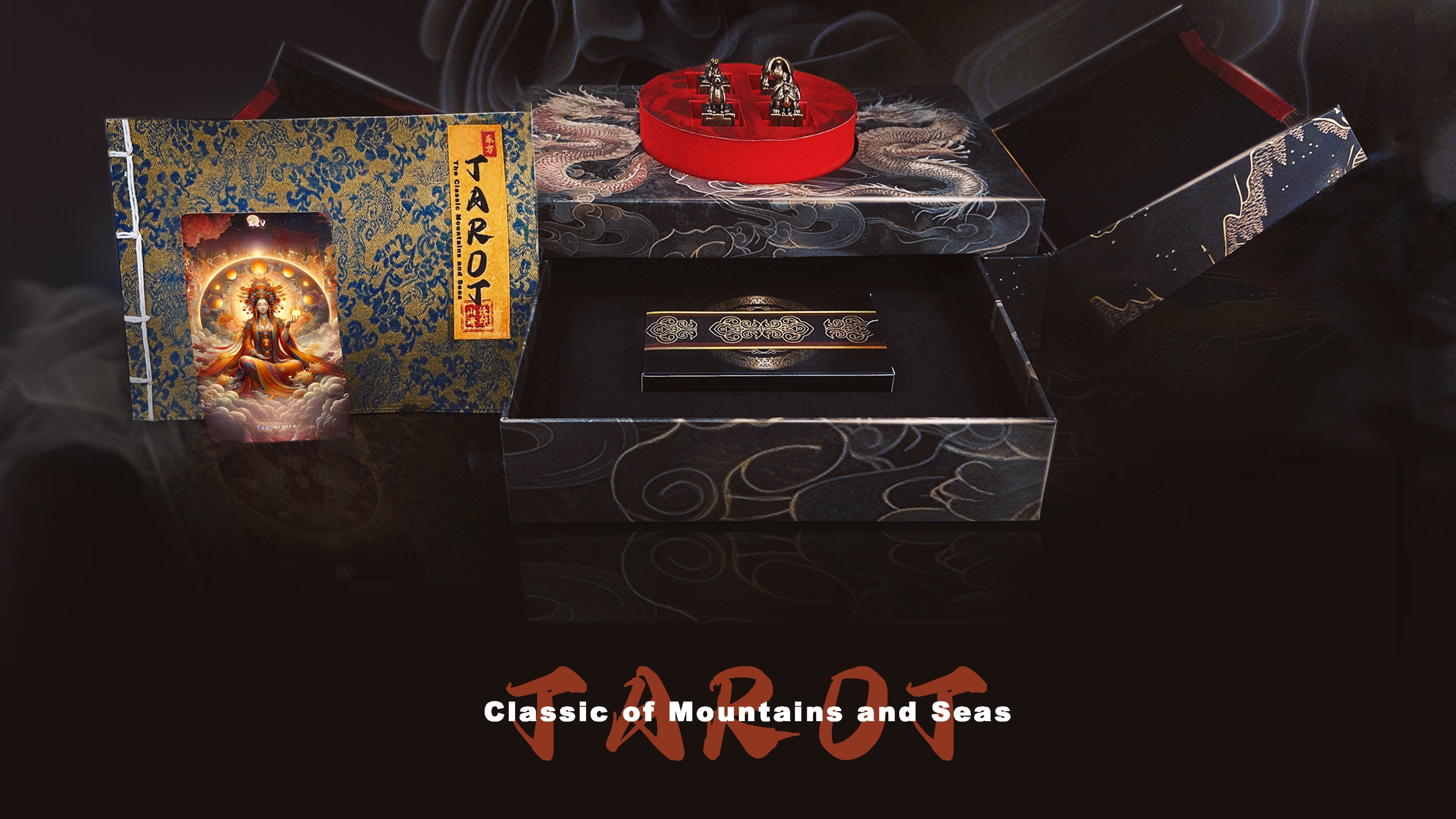 The outer box draws inspiration from "The Classic Mountains and Seas Tarot," meticulously depicting the grandeur of mountains and oceans with traditional craftsmanship, under a suspended moon, symbolizing profound meaning. The moon, a bridge between cosmic and earthly energies, complements the "mountain and sea" theme, adding a touch of mystery and romance.